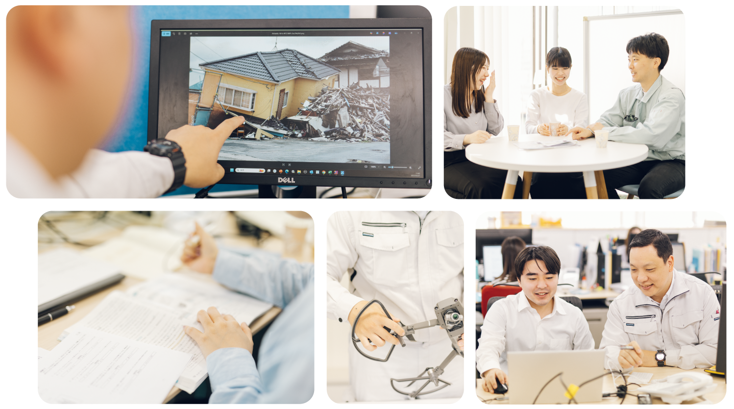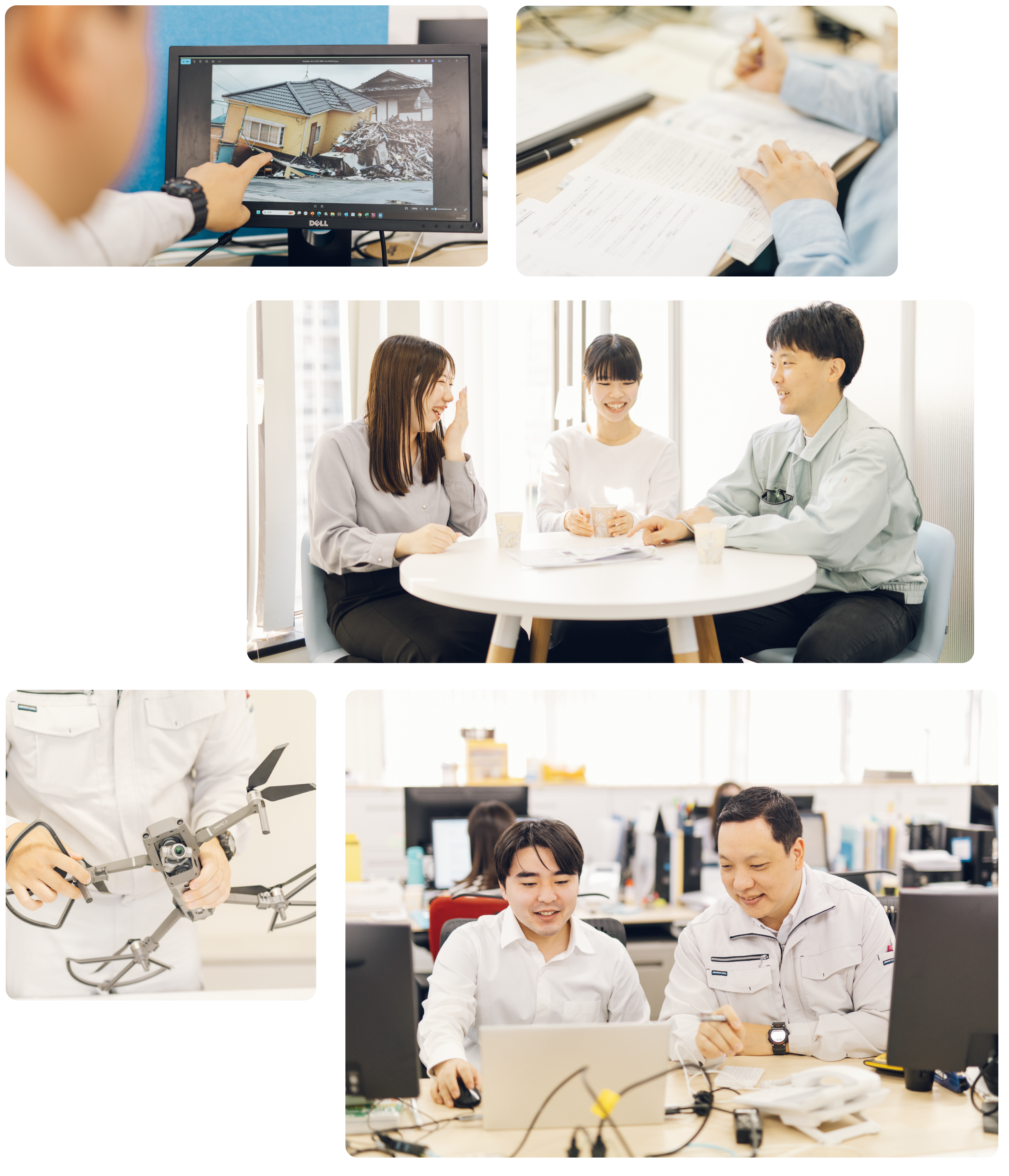 最初は右も左も分からない状態でしたが、小規模な案件から一つずつ経験を積み重ね、 今では大型案件にも対応できるようになりました。1人で複数の案件を同時に抱える忙しさはありますが、 現場で判断し、状況を整理し、報告までやり切ったときの達成感は何にも代えがたいものです。 責任が大きい仕事だからこそ、自分の判断が被災者の支えになっていると実感しています。